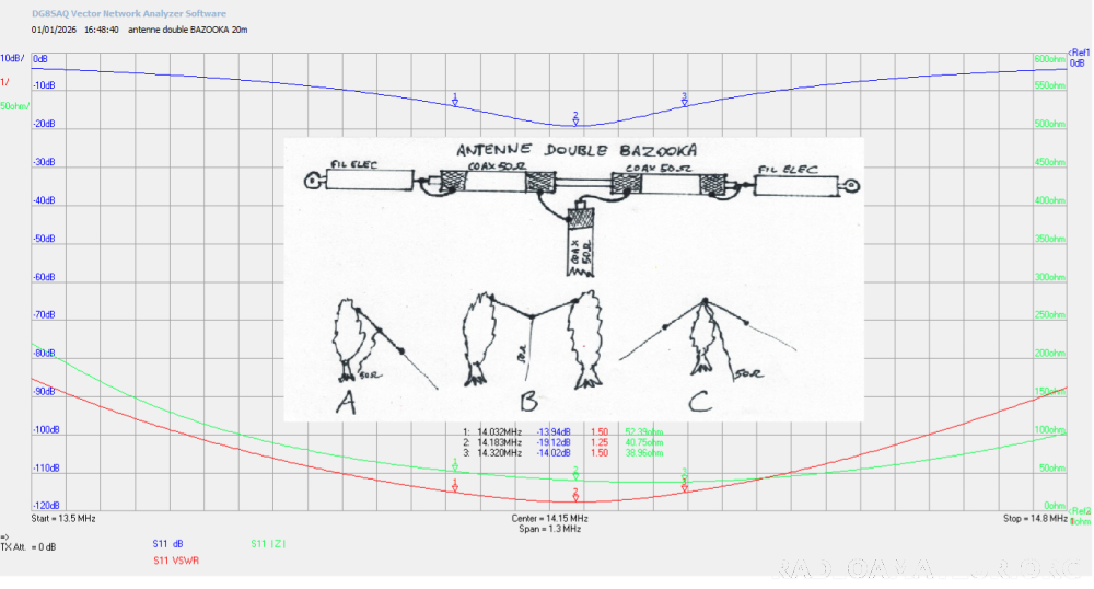 Antenne filaire symétrique double BAZOOKA spécialement calculée et taillée pour la bande 20m avec un rendement et une bande passante nettement supérieure au dipôle classique. La fréquence centrale est 14.180MHz (avec encore un ROS de 1,5/1 à 14.030MHz et 14.320MHz) la longueur totale est de 9,95m et peut être installée en sloper (inclinée à 45°) ou horizontale en V accrochée de chaque côté à un support, ou horizontale en V inversé, avec accroche au milieu au niveau de l'isolateur. Le ROS minimum à la fréquence de résonnance sera obtenu en jouant sur l'angle entre les deux parties du dipôle, mais dans tous les cas, il sera inférieur à 1,25/1 la puissance admissible est de 100 watts minimum. Livrée comme sur les photos. Longueur totale : 9,95m poids tout compris 140 grammes. Idéal pour portable vacances SOTA POTA expéditions, QRP ou même en station fixe. Prix 33 euros