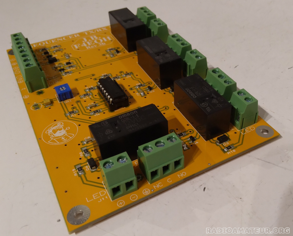 Séquenceur F4EOH design F1FRV de dernière génération REV3b neuf, monté et testé, avec des composants neufs, permet, grâce à l'utilisation de relais 1RT QRO, de 16A insensibles à la HF, d'alimenter ou d'interrompre l'alimentation de chacun des éléments de la station (ampli, préampli, émetteur etc.) , que ce soit avec des tensions positives, négatives ou même alternatives, en utilisant soit le contact repos, soit le contact travail de chaque relais. La longueur des séquences se règle avec un petit ajustable sur la platine : la temporisation maximale est de l'ordre de 1.5 seconde lors du passage en TX ou en RX. Ceci donne environ 300 ms minimum entre changement d'état de 2 relais successifs. Arrêtez de cramer des préamplis!. Plus de renseignements: http://f1frv.free.fr/Annonces/Sequencer.zip. Dimensions du séquenceur monté : 14cm X 9,5cm X 2,4cm, poids : 134g. Prix 65 euros