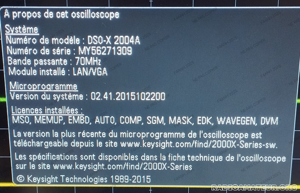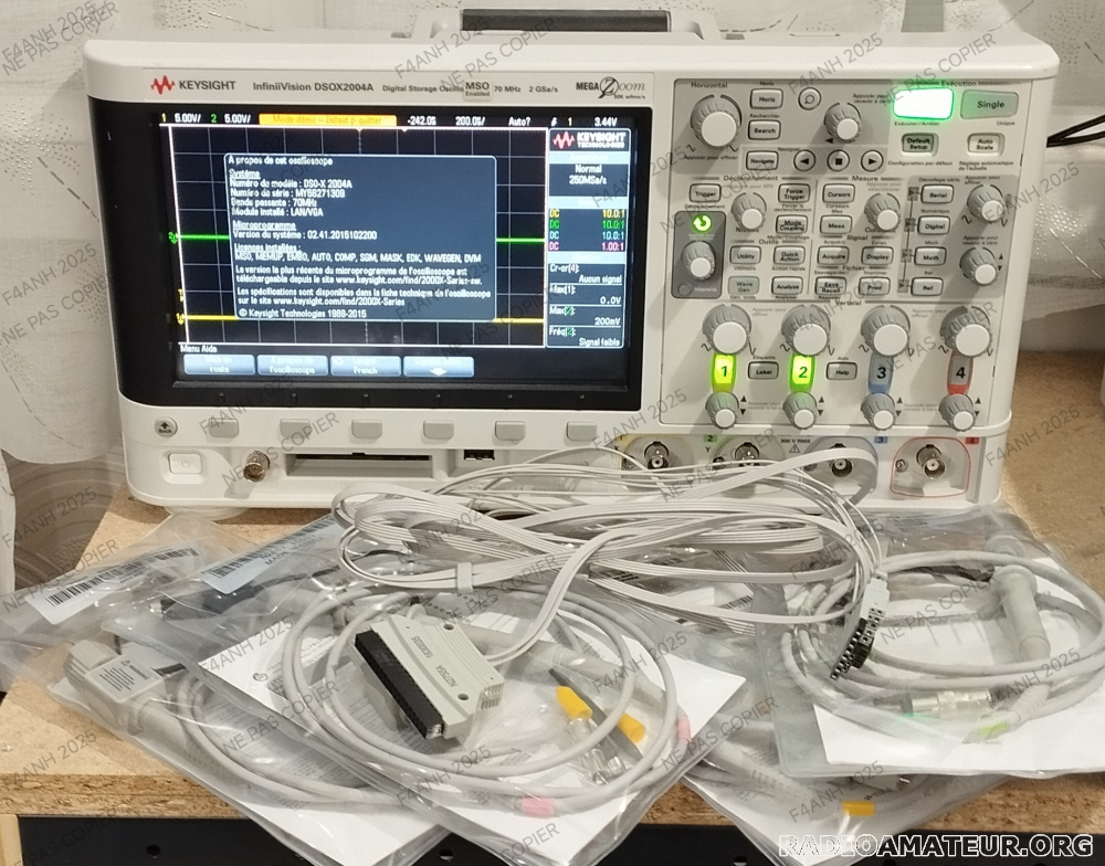 Vente ou échange contre TRX type FT-991A ou équivalent multimode HF+VHF : mon oscilloscope Keysight ( Agilent) InfiniiVision DSO-X 2004A 70 MHz 4 voies + 8 entrées numérique (mode MSO activé). Appareil utilisé dans un labo non-fumeur. Etat proche du neuf, n'a servi que quelques heures. Dernier étalonnage le 5/08/2016 (certificat et licence fournit). Module LAN-VGA installé. Extension mémoire 1 Mpts/voie activée. Fonction d'aide intégrée. Fonctions Math. Option décodage signaux (CAN/LIN, I2C/SPI, UART/RS232) activée. Fonction Générateurs de signaux activée. 3 port USB ( 1 Host et 1 OTG au dos + 1 pour clé USB devant). Écran WVGA de 8,5 pouces non tactile. Firmware installé : 02.41... (le firmware 2024 est disponible sur le site de Keysight). 15 langues installées. Fournit avec : - documents papiers et pdf d'origine, - cordon secteur, - jeux de sonde MSO - 4 sondes N2862B 150MHz passive. Déplacement possible sur département 68 et limitrophes. etudis toutes propositions , l'aspect esthétique du trx n'est pas dans mes critères, du moment que ça fonctionne et qu'il y a HF+VHF et plus. Contact par téléphone ou mail vente possible, faire offre.
